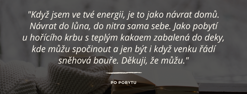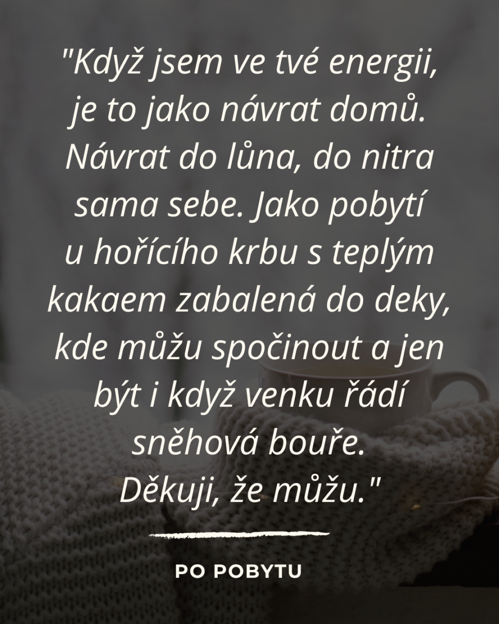 "Když jsem ve tvé energii, je to jako návrat domů. Návrat do lůna, do nitra sama sebe. Jako pobytí u hořícího krbu s teplým kakaem zabalená do deky, kde můžu spočinout a jen být i když venku řádí sněhová bouře. Děkuji že můžu."